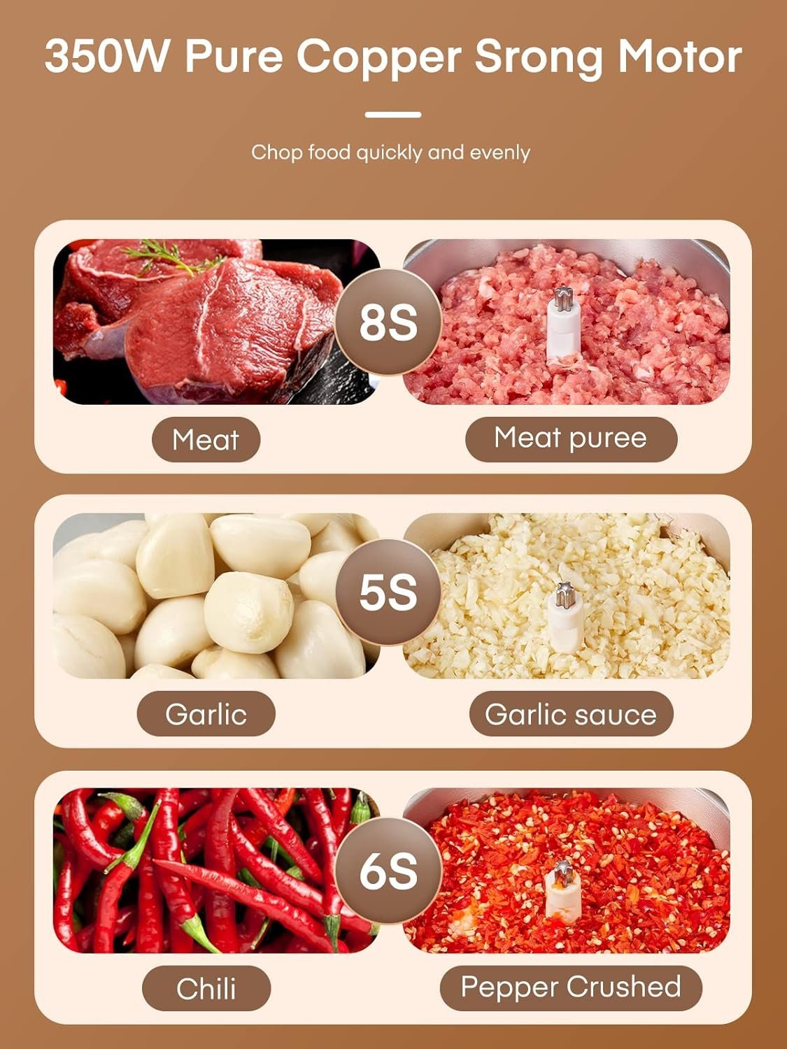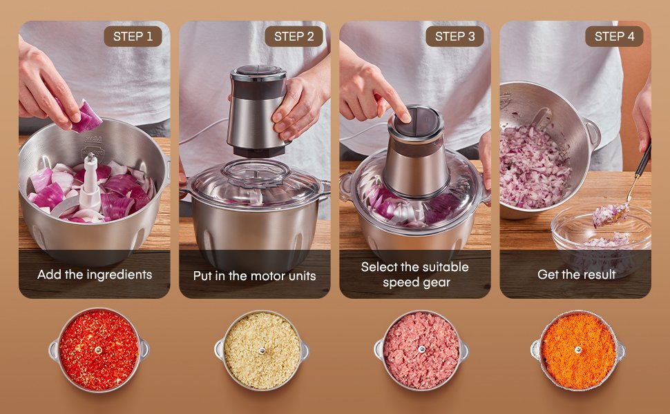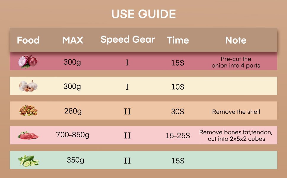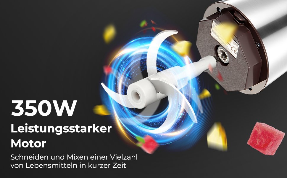 Der FOHER zerkleinerer ist kompakt und handlich und lässt sich einfach durch drücken des oberen schalters aktivieren. Die scharfe klinge und die hohe leistung von 350 W können lebensmittel in sekundenschnelle zerkleinern und zeit sparen.