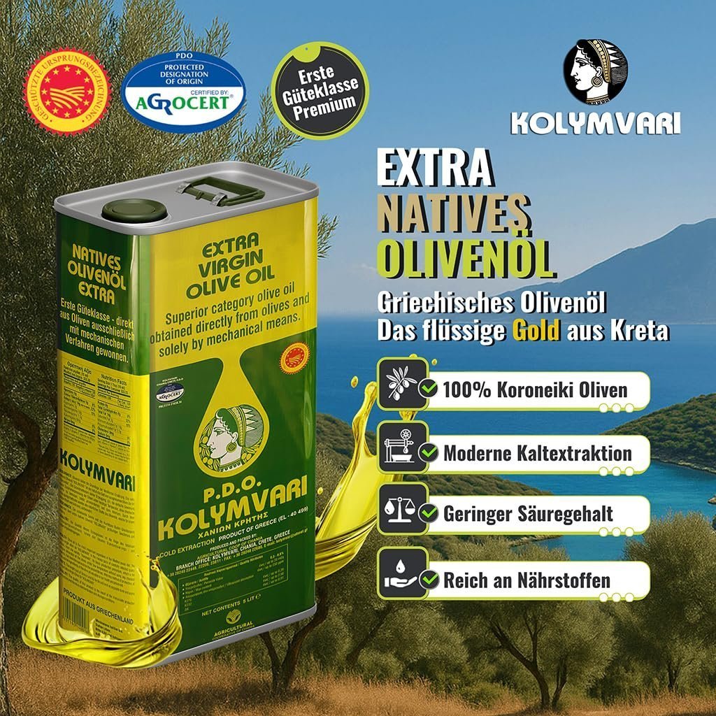 Erleben Sie das Aroma und die Qualität des Kolymvari Extra Nativ Olivenöls – aus Koroneiki Oliven Kretas mit geschützter Ursprungsbezeichnung (g.U.)